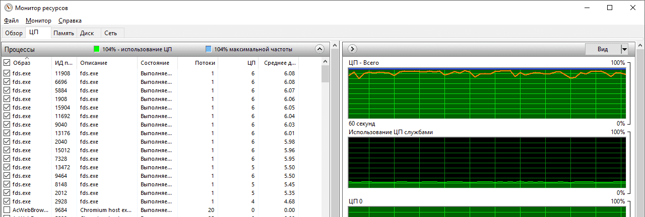 After starting FDS in multithreaded mode with OpenMP technology on Windows OS, the Resource Monitor will display one ‘fds’ process and several associated threads:
