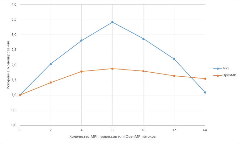 The graph below illustrates how the speeding up of the simulation time varies with an increase in the number of MPI processes or OpenMP threads.