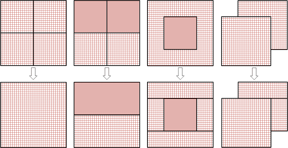 The examples below demonstrate the outcome of the Combining stage in forming MESH groups for various relative placements of calculation areas.