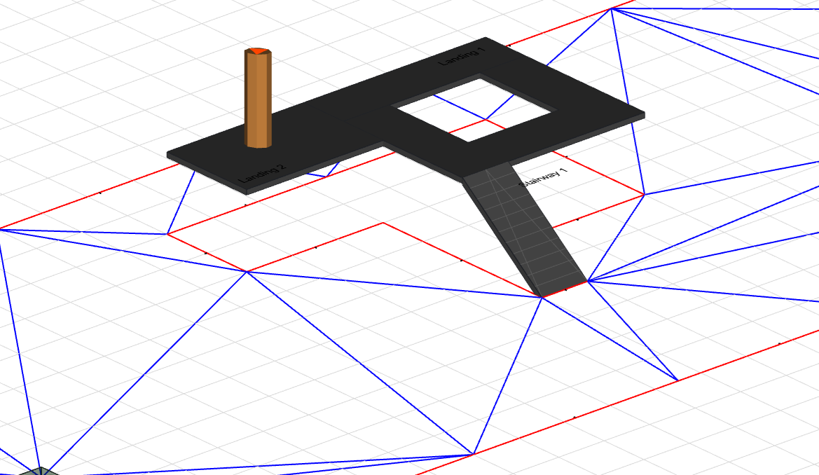 Additionally, in real buildings, there must be unobstructed space above stairway to allow people to move up or down without hindrance. Therefore, a portion of the space above the stairway near their upper edge is also marked as prohibited for movement. Typically, such a “virtual” obstruction is added to the area formed by the floor: