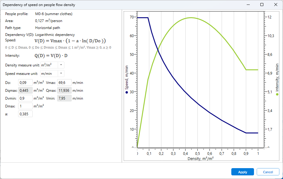 The relationship between intensity and density, along with the maximum allowable flow intensity for a given path type, is used as a factor to limit the speed of people moving through an opening.