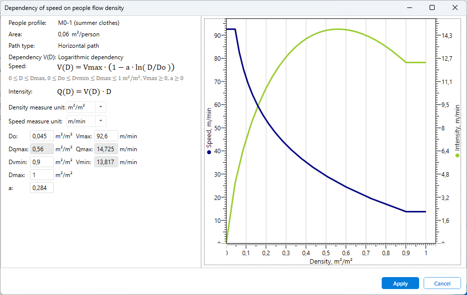 - Evacuation path movement parameters – defines which types of paths the person is allowed to move on (“Movement Allowed” property) and the speed–density relationship for the person’s movement.