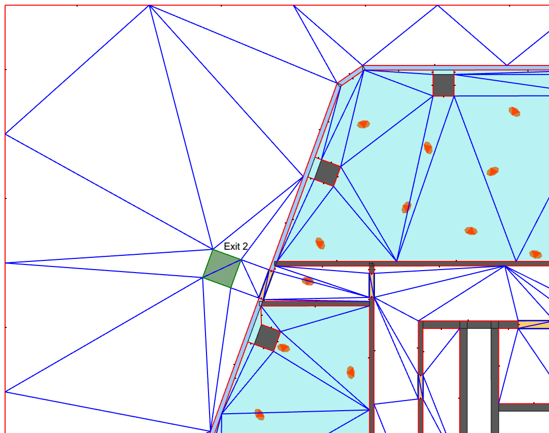 - Obstacle edges (shown in red): These cannot be crossed by people. In unbounded areas, the area boundaries are also represented as obstacles.