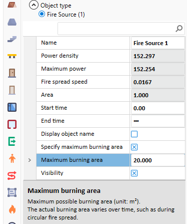 If the “Specify Maximum Burning Area” option is enabled for a fire source, you can set a maximum burning area in the “Maximum Burning Area” field, which may differ from the area of the defined fire source.
