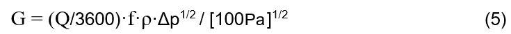 The mass flow rate G can be obtained from the volumetric flow rate V by multiplying by the air density ρ, kg/m³. However, note that G is measured in kg/s, while V is in m³/h, so