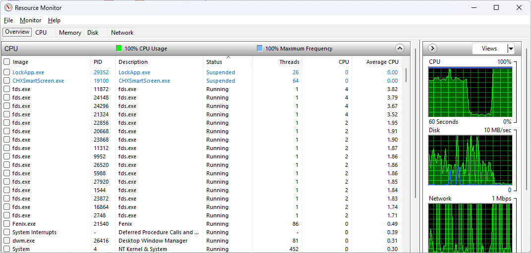 After starting FDS in multithreaded mode using MPI on a single computer in Windows OS, you can see multiple “fds” processes in the Task manager:
