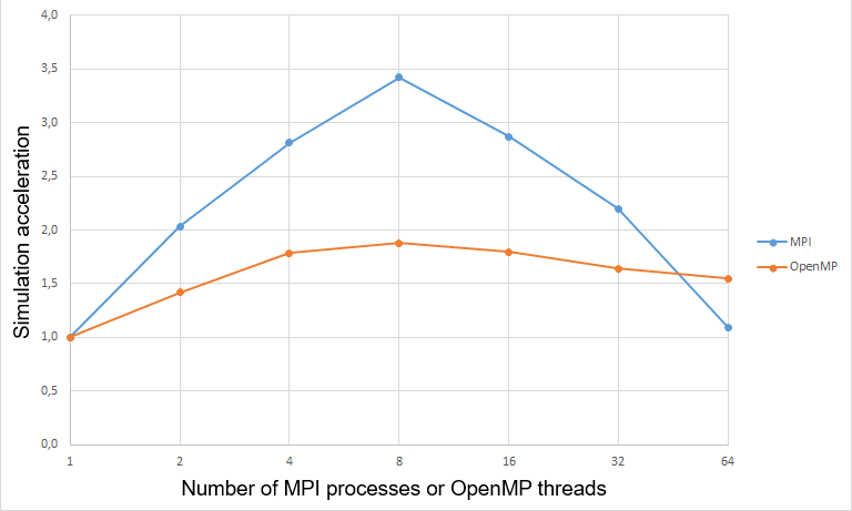 The graph below shows the change in simulation acceleration with an increasing number of MPI processes or OpenMP threads.