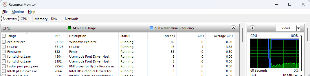 After starting FDS in multithreaded mode using OpenMP feature, in the Task manager in Windows OS, one can see a single “fds” process and several threads associated with it: