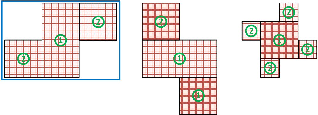 The following examples show the result of the Merging stage when forming MESH groups for different relative positions of the calculation areas.
