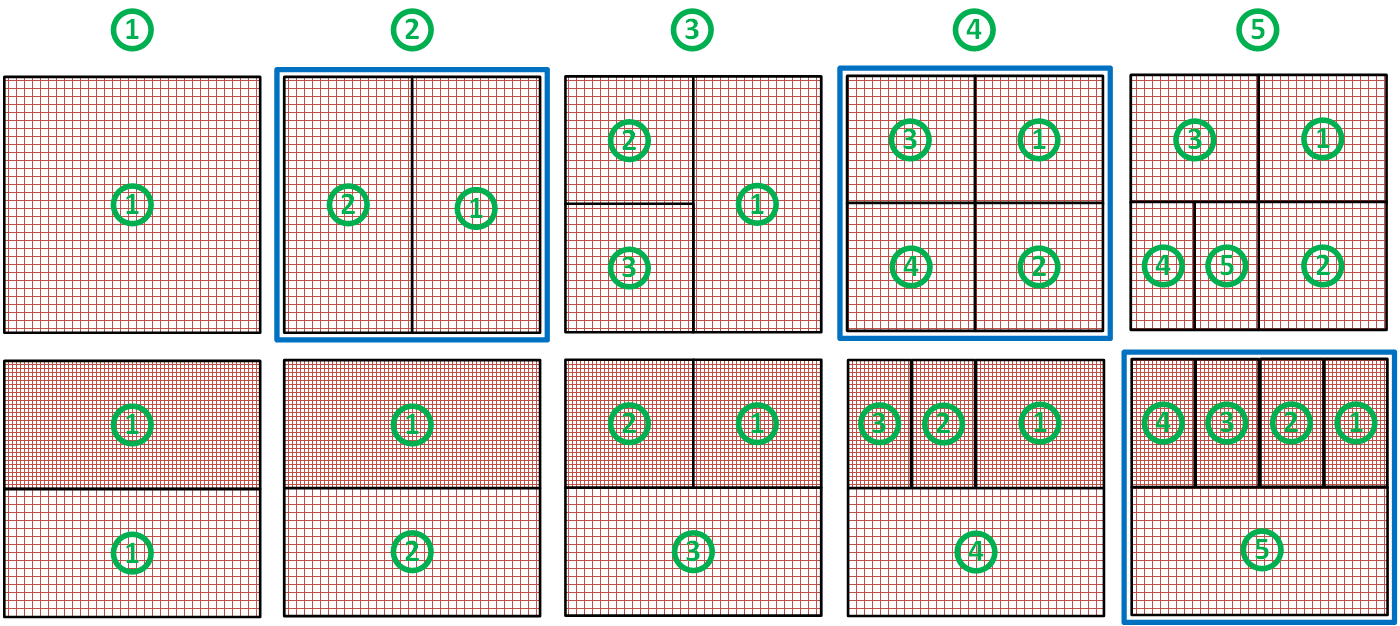 The following examples show the results of the Splitting and Balancing stages for different numbers of simulation threads (number on top) when the number of meshes after the Splitting stage does not exceed the number of threads.