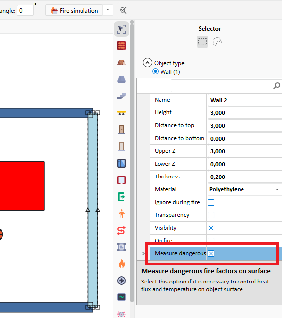 To measure OFP on the surface of other objects, select the desired object on the scene and check the Measure dangerous fire factor on surface box in the properties of that object.